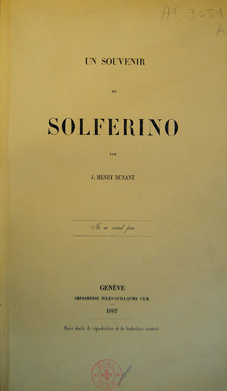 Titelblatt des Buchs "Un souvenir de Solférino" von J. Henry Dunant (1828-1910, Friedensnobelpreis 1901), Erstausgabe, Genf 1862. (Foto von RomanDeckert lizensiert durch CC BY-SA 4.0 via Wikimedia Commons) HLB
