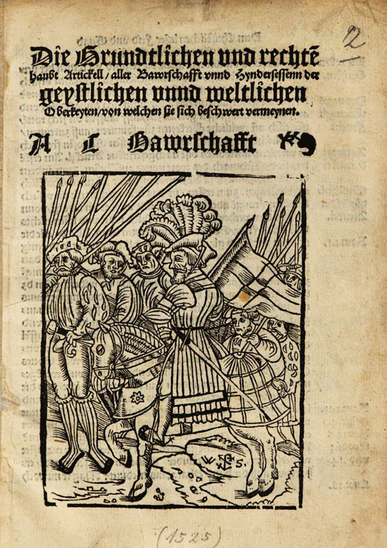 In den sogenannten Zwölf Artikel wurden Forderungen zur Verbesserung der Lebenssituation des gemeinen Mannes verbreitet. Titelblatt einer Fassung des Flugschrift, die 1525 gedruckt wurde. (Staats- und Stadtbibliothek Augsburg,4 TH 1354)