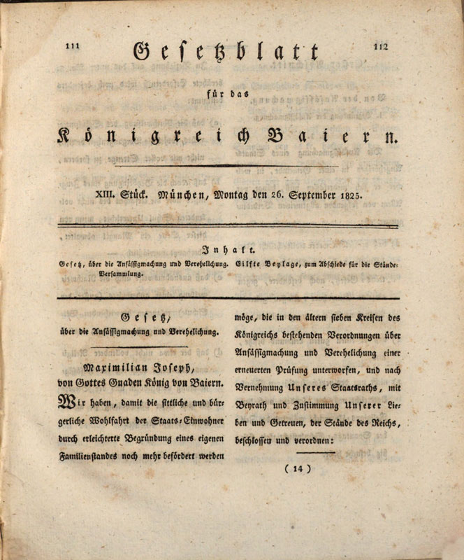 Titelseite des Gesetzes zur Ansässigmachung und Verehelichung aus dem Gesetzblatt für das Königreich Bayern, München 1825. (Bayerische Staatsbibliothek, BHS VIII D 5-1825) HLB