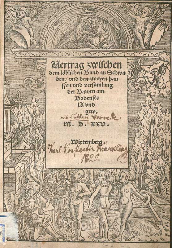 Titelseite des Vertrags von Weingarten mit einer Stellungnahme Martin Luthers (1483-1546), 1525. (Landesbibliothek Coburg, Lu Ia 1525,12) HLB