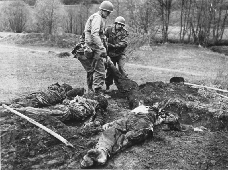 Amerikanische Soldaten stehen neben den Leichen von Gefangenen, die während der Todesmärsche 1945 ermordet wurden. (Credit: Yad Vashem. Yad Vashem. The World Holocaust Remembrance Center) HLB