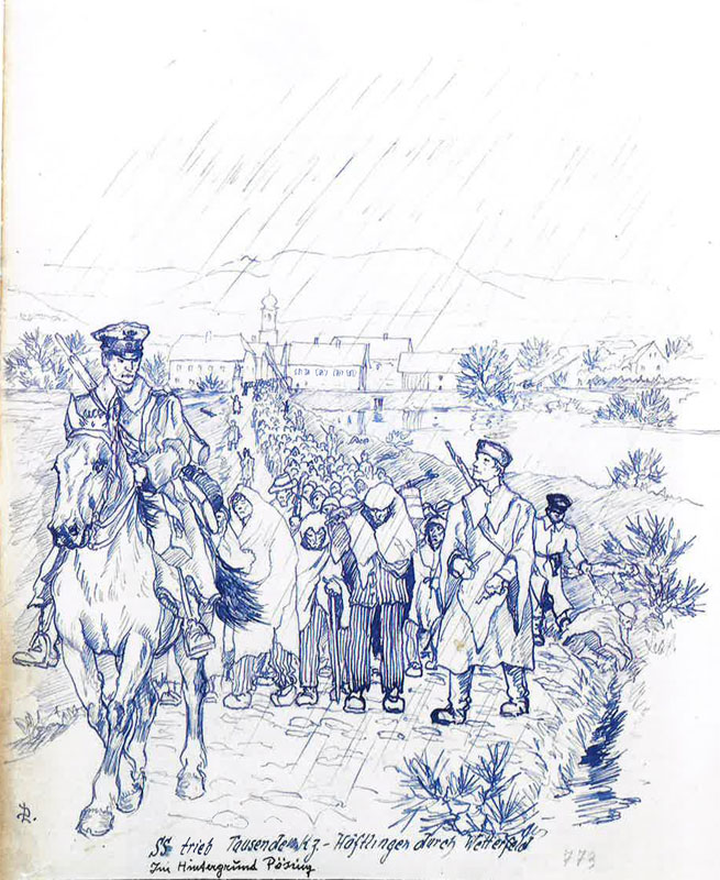 Todesmarsch durch Wetterfeld . Im Hintergrund: Pösing (Landkreis Cham). Zeichnung von Ludwig Diess (Künstler, bebilderte die Rodinger Ortschronik 1896-1981) anhand zeitgenössischer Erzählungen, 1945. (Stadtarchiv Roding) HLB