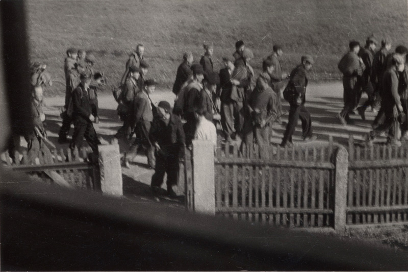Gefangene (vermutlich aus Nürnberg) auf dem Todesmarsch nach Dachau. Geheime Aufnahme von Maria Seidenberger aus dem Fenster, 26. April 1945. (United States Holocaust Memorial Museum, 99215) HLB
