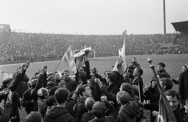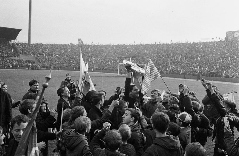 1966 gewann der TSV 1860 München zum ersten und bislang einzigen Mal die Deutsche Meisterschaft. Im Bild zu sehen ist Torwart Petar Radenković (geb. 1934) mit der Meisterschale im Grünwalder Stadion in München von Fans umgeben. (Foto: © HORSTMÜLLER)