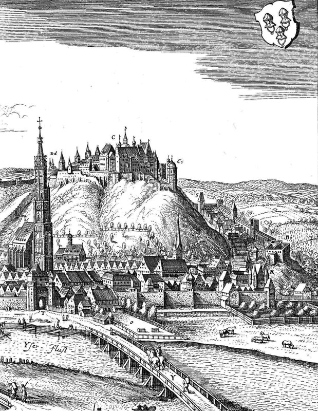 Sicht auf die Burg Trausnitz von Westen. Stich von Martin Zeiller aus dem Jahre 1644. (aus: Merian, Matthäus: Topographia Bavariae, Frankfurt a. M. 1644, 38. Bayerische Staatsbibliothek, 2 Bibl. Mont. 1046-3/4)