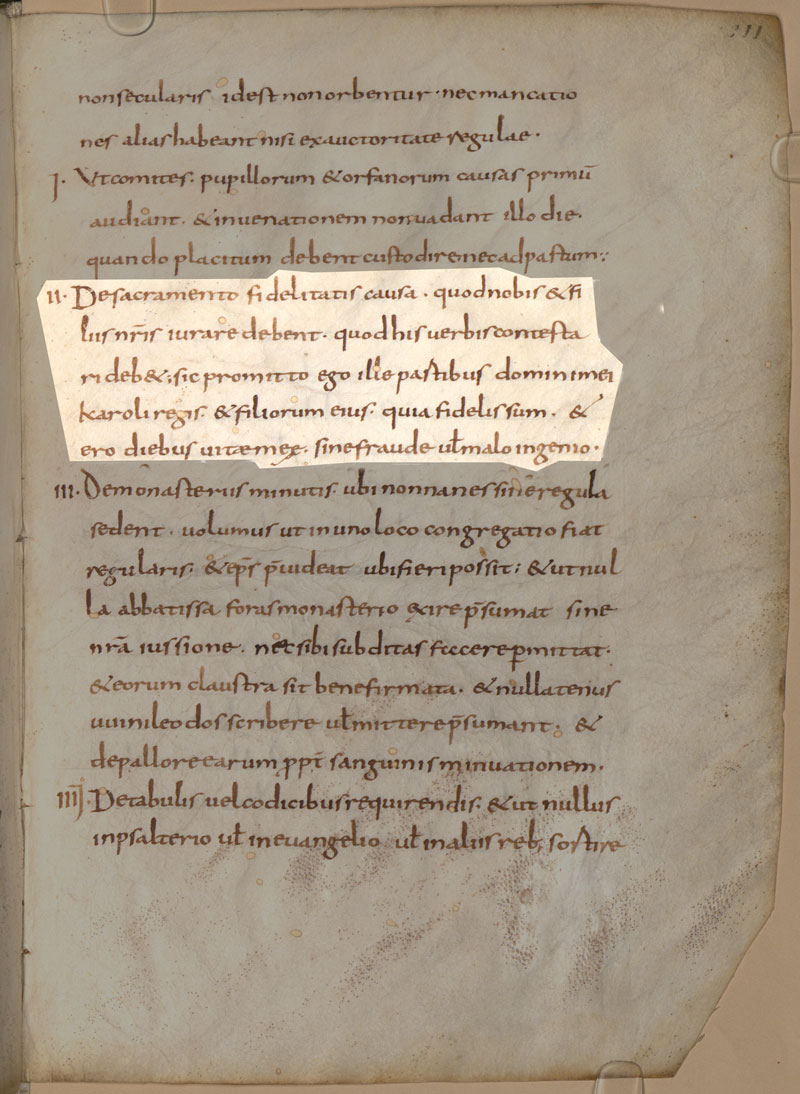 Treueidformular (Text hervorgehoben). Akten zum adoptianischen Streit. BSB Clm 14468. fol. 111r., Regensburg, 821, (Bayerische Staatsbibliothek) HLB