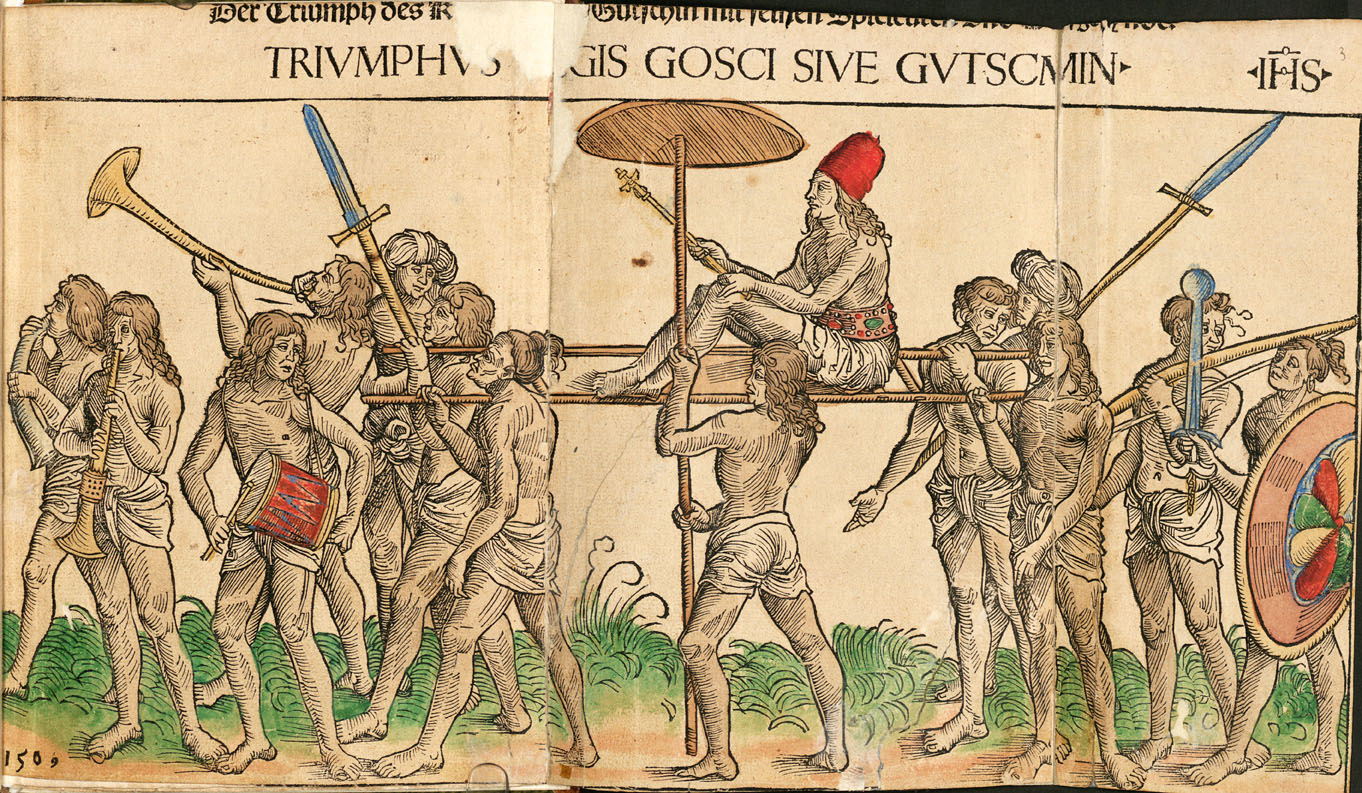 Darstellung des Triumphzuges des Königs von Cochin aus dem Jahre 1509. (Holzschnitt aus: Springer, Balthasar: Die Merfart [...], Oppenheim 1509; Bayerische Staatsbibliothek Rar. 470)