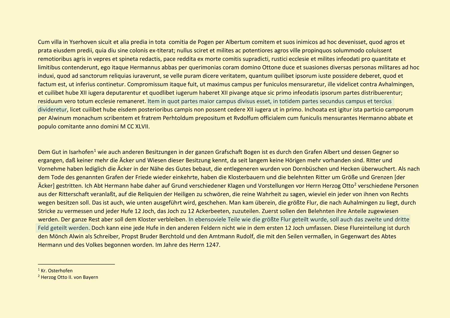 Abbildung 3: Niederaltaicher Teilungsurkunde von 1247. Sie belegt die Neuvermessung und -aufteilung in Form der Dreizelgenwirtschaft des zuvor vernachlässigten klösterlichen Hofes Langenisarhofen (Lkr. Deggendorf). (Original: Österreichisches Staatsarchiv, HS R 83-2 f. 190); Übersetzung nach Günther Franz, Quellen zur Geschichte des deutschen Bauernstandes im Mittelalter, Darmstadt 1967, 329-331. (Prof. Dr. Gunther Franz) HLB
