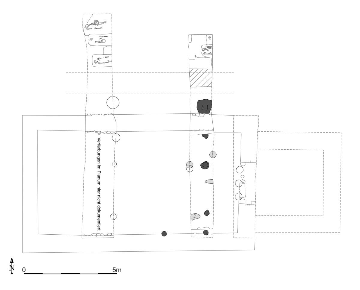 Übersicht über die Holzpfostenbefunde auf dem Petersberg unterhalb der Tuffsteinkirche der Karolingerzeit. Rund gestrichelt Pfostenlöcher, die anhand des Profils rekonstruiert werden können. Lage aber leicht ungenau. (Miltz) HLB