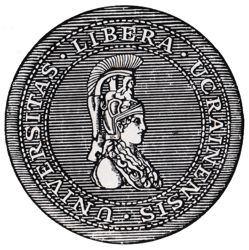 Das Logo der Ukrainischen Freien Universität. Die Umschrift lautet: UNIVERSITAS LIBERA UCRAINENSIS. (aus: Janiw, Wololdymyr: Urkrainische Freie Universität. Kurzgefasste Geschichte und dokumentarische Ergänzungen, München 1976. Bayerische Staatsbibliothek, Z 77.516)