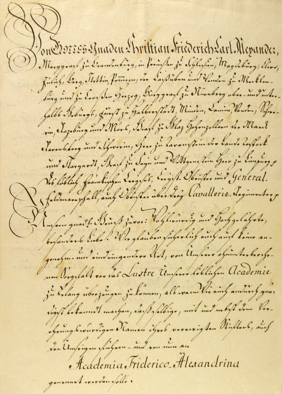 Am 12. Oktober 1769 verfügte Markgraf Alexander die Umbenennung in „Academia Friderico-Alexandrina“. (Universitätsarchiv Erlangen-Nürnberg A1/1 Nr. 49) HLB
