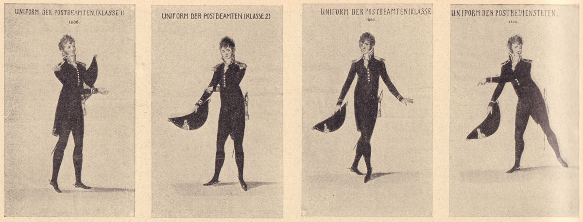 Älteste Unformen der bayerischen Postbeamten nach den Vorschriften vom Jahr 1806. V.l.n.r.: Uniform für Oberpostmeister; Uniform für Oberpostamtsverwalter und Postinspektoren; Uniform für Postmeister, Postverwalter, Postsekretäre und Oberpostamts-Stallmeister; Uniform für Postbedienstete. Abb. aus: Das Bayerland, Jahrgang 36 vom April 1925, 256. (Bayerische Staatsbibliothek, 4 Bavar. 198 t-36) HLB