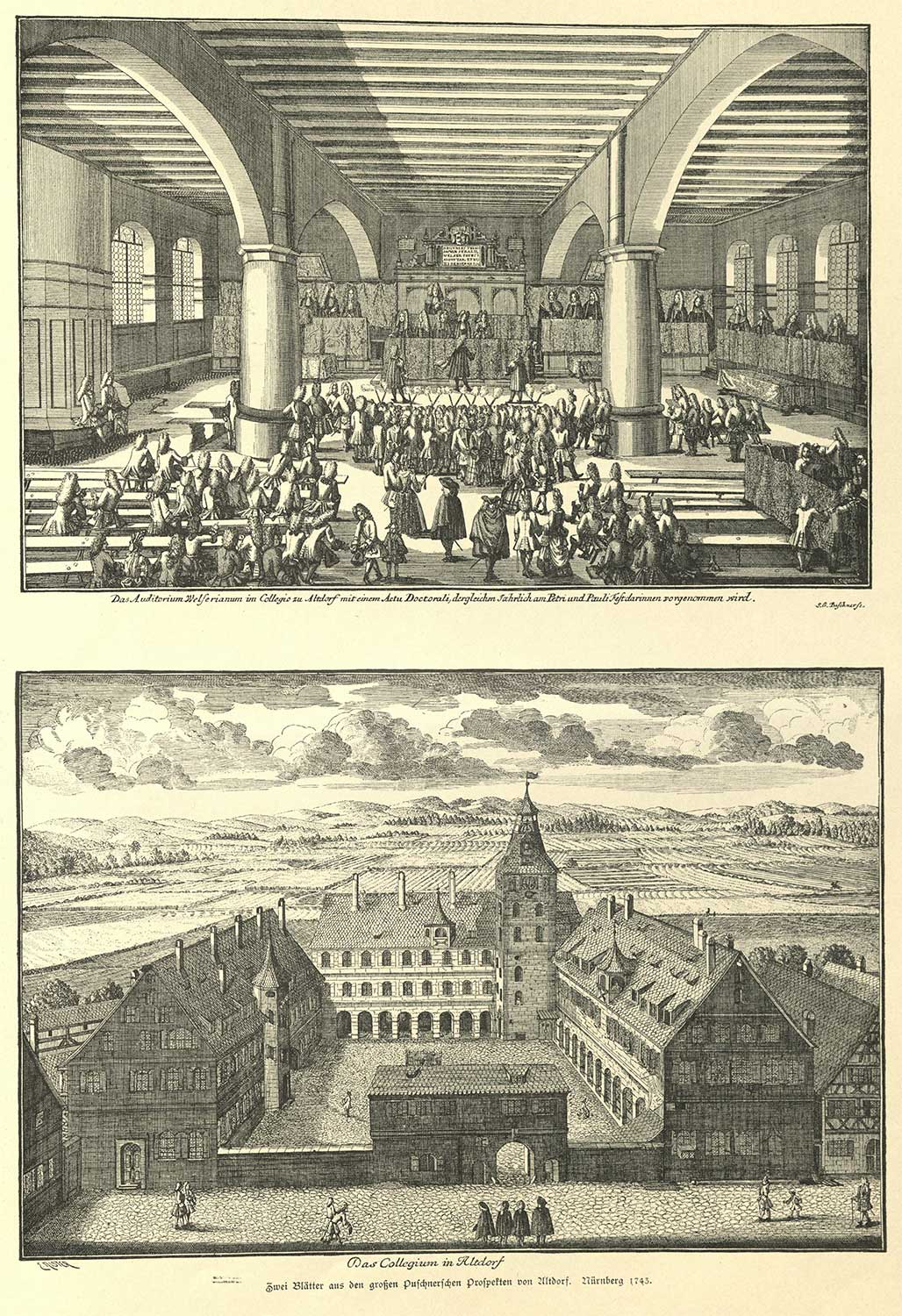 Ansicht des Auditorium Welserianums und des Collegiums der Universität Altdorf 1743, Kupferstich von Johann Georg Puschner (1680-1749). Im von Sebald Welser (1557-1589) 1582 gestifteten Hörsaal der Universität Altdorf fanden juristische Vorlesungen statt. Die Universität wurde vom Rat der Reichsstadt Nürnberg verwaltet. Abb. aus: Hugo Barbeck, Alt-Nürnberg. Kulturgeschichtliche Bilder aus Nürnbergs Vergangenheit, Bd. 14: Die Universitätstadt Nürnberg. Die Nachbarstadt Altdorf und ihre Umgebung, die Nachbarstadt Fürth und ihre Umgebung, Nürnberg 1894, Blatt 3. (Bayerische Staatsbibliothek, 2 Bavar. 32 v-11/14)