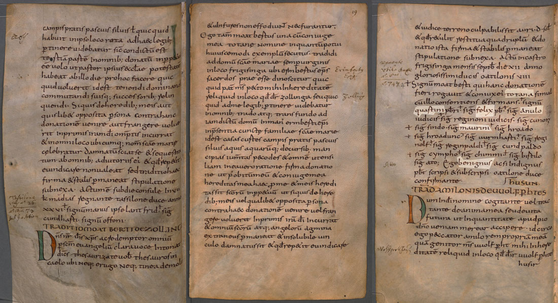 Urkunde von 743 aus dem Freisinger Cozroh-Codex (Romanische Personennamen in der Zeugenreihe hervorgehoben), HL Freising 3a, fol.18v, 19r, 19v, Freising, 824. (Bayerisches Hauptstaatsarchiv via CC BY-NC-SA 4.0) HLB
