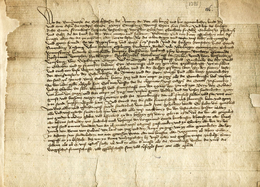 12. März / 9. April 1385: Die Städte des Bundes am Rhein beeiden, dass das Bündnis der Städte des Bundes in Schwaben und Franken mit Zürich, Bern, Solothurn, Luzern und Zug mit ihrer Zustimmung geschlossen wurde. (Institut für Stadtgeschichte Frankfurt am Main, Reichssachen I Nr. 156)