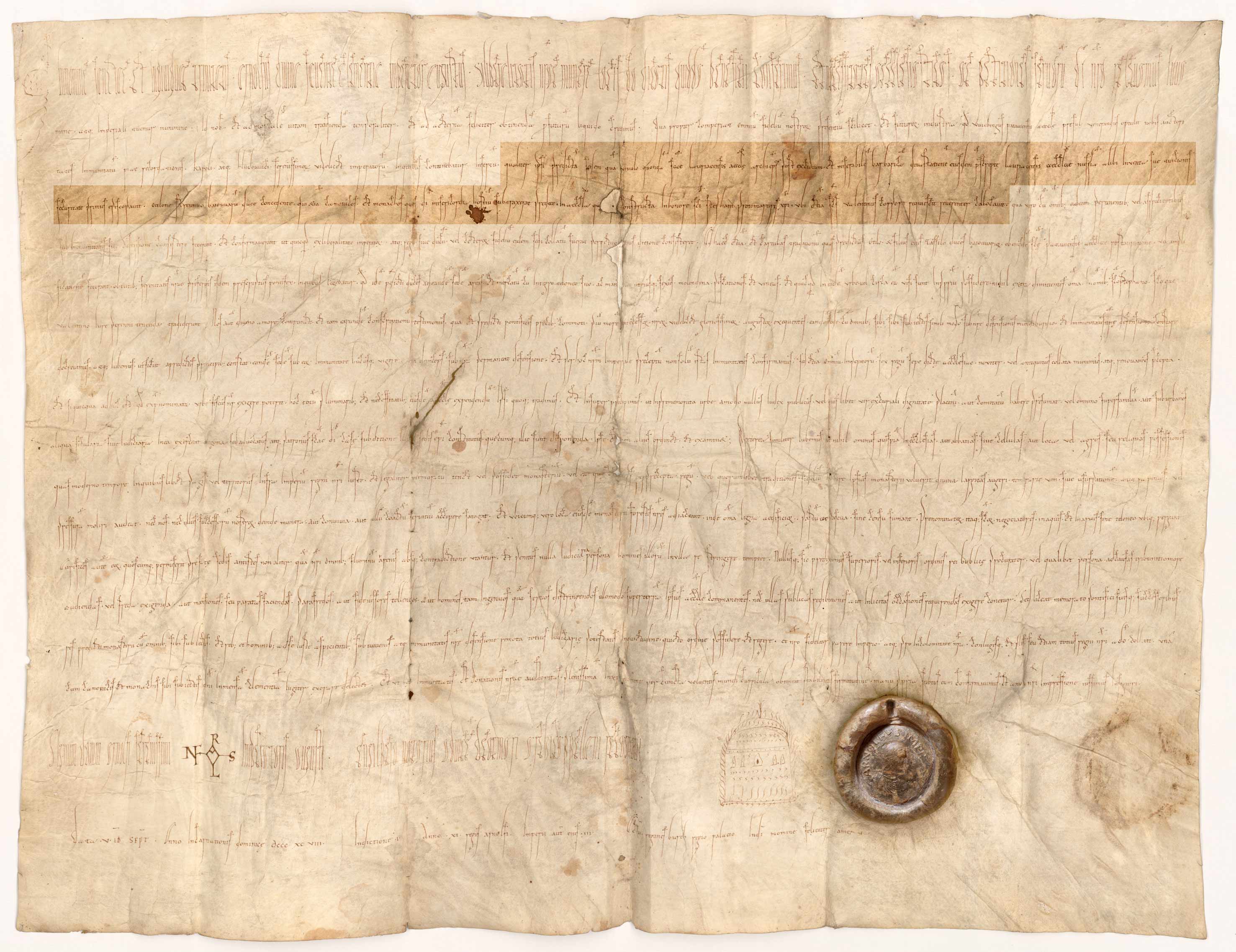Von Bischof Pilgrim auf der Grundlage eines echten Privilegs Kaiser Arnulfs von 898 neu angefertigte Urkunde mit eingeschobener Behauptung der Übertragung eines Erzbischofssitzes von Lorch (Enns) nach Passau (markiert). (Original ohne Markierung: Bayerisches Hauptstaatsarchiv, Hochstift Passau Urkunden 11) HLB