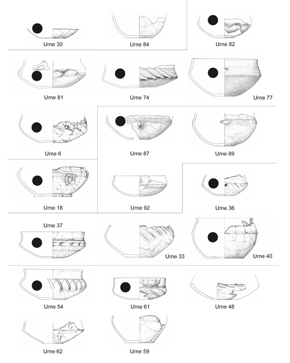 Urnen aus dem Brandgräberfeld von Forchheim/Opf. (Abb. aus: Raimund Masanz: Völkerwanderungszeitliche Brandgräber aus Freystadt-Forchheim (Oberpfalz). Ein Beitrag zum Problem der „Gruppe Friedenhain-Přešťovice", Kallmünz 2017.) HLB
