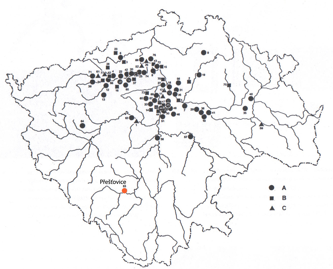 Verbreitung der spätrömischen Brand- und Körpergräber in Böhmen. (Jaroslav Jiřík, Kennzeichnung Přešt’ovice durch Sonja Schweiger) HLB