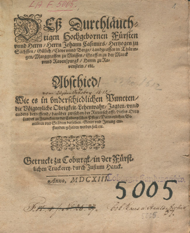 Die Zentralisierungsbestrebungen Johann Casimirs (1564-1633) führten zu Spannungen zwischen Adel und Landesherrn. Die Auseinandersetzungen gipfelten 1612 in der als Casimirianischer Abschied bezeichneten Verfassungsurkunde. In dieser wurden die Zuständigkeiten von Adel und Fürstentum aufgeteilt. (Staatsarchiv Coburg, LA F Nr. 5005) HLB