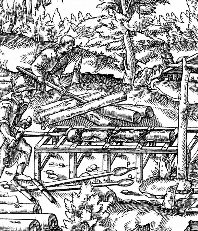 Verfertigung von Holzrohren (Deicheln) für die Errichtung von Holzrohren. Holzschnitt aus Georg Agricolas De Re Metallica, 1556. HLB