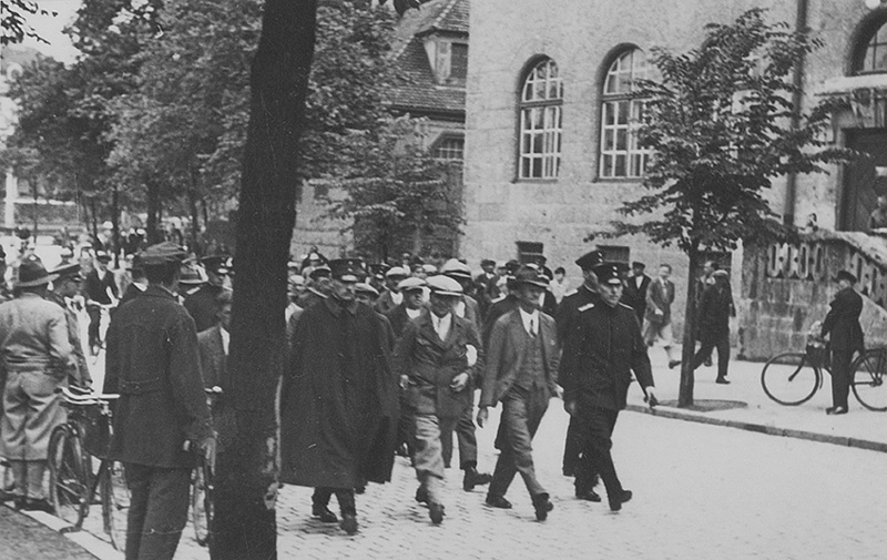 In Straubing wurden am 30. Juni 1933 18 Sozialdemokraten verhaftet. Auf dem Bild ist zu sehen, wie 16 der Häftlinge am Hauptpostgebäude vorbei Richtung Bahnhof abgeführt werden, um im Konzentrationslager Dachau interniert zu werden. (Stadtarchiv Straubing, Fotosammlung Helene Joringer, Fotograf Karl Götz)