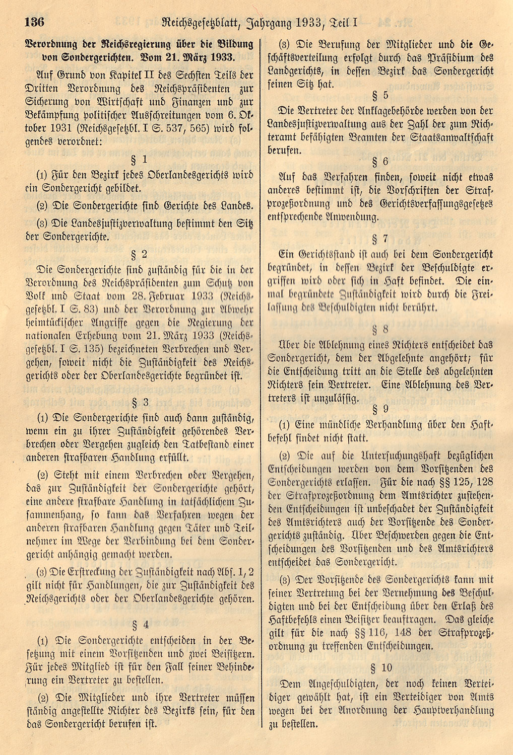 Verordnung über die Bildung von Sondergerichten vom 21. März 1933 (Ausschnitt). Abb. aus: Reichsgesetzblatt 1939, Teil 1, Berlin 1939, 136. (Bayerische Staatsbibliothek, 4 J.publ.g. 946 wa-1933,1) HLB