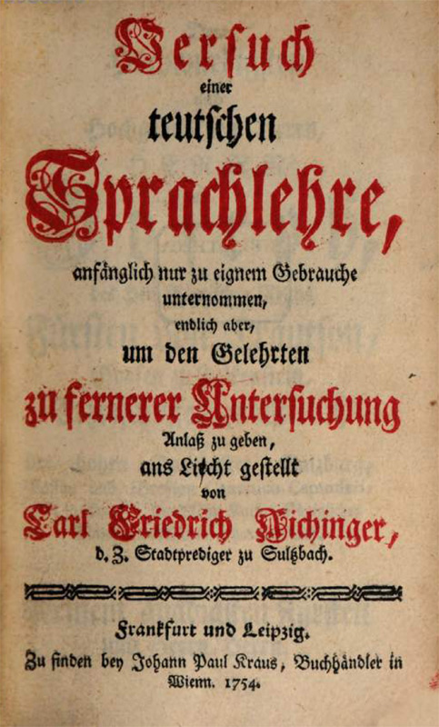 Titelblatt von Carl Friedrich Aichingers "Versuch einer teutschen Sprachlehre", Frankfurt/Leipzig 1754. (Bayerische Staatsbibliothek, L.germ. 11) HLB