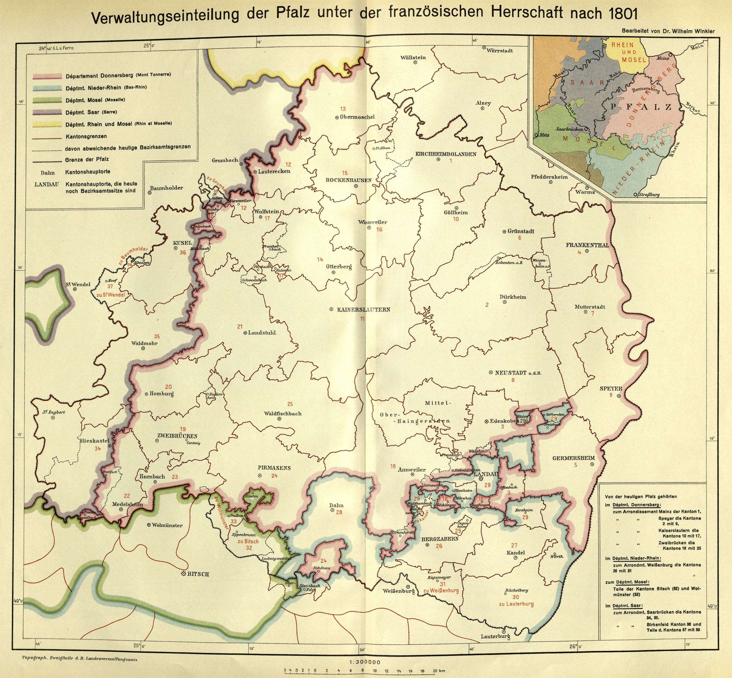 Die Verwaltungseinteilung der Pfalz unter französischer Herrschaft nach 1801. (aus: Winkler, Wilhelm: Pfälzischer Geschichtsatlas, Neustadt an der Haardt 1935, Karte 9)
