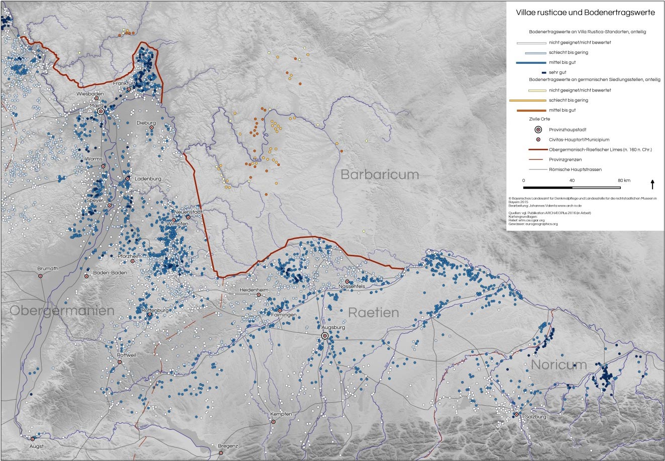 Limesverlauf und Verbreitung der Villae rusticae (nach Chr. Flügel und J. Obmann, Bayerisches Landesamt für Denkmalpflege) HLB