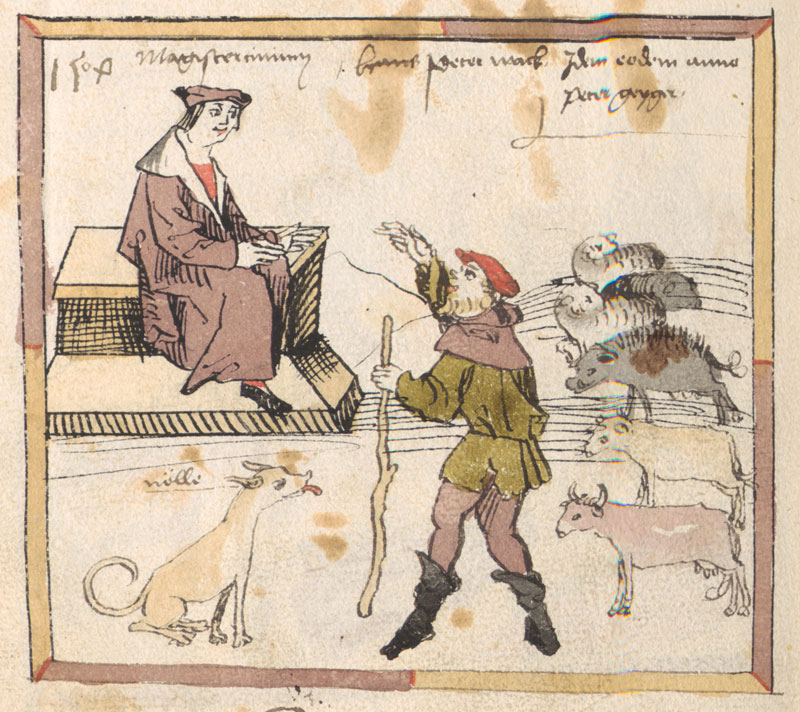 Der Hirt schwört dem Volkacher Bürgermeister die Tiere der Bürger zu hüten. Abb. aus dem sog. Volkacher Salbuch, Volkach 1504, fol. 411v. (Stadtarchiv Volkach B2, ausgestellt im Museum Barockscheune Volkach)