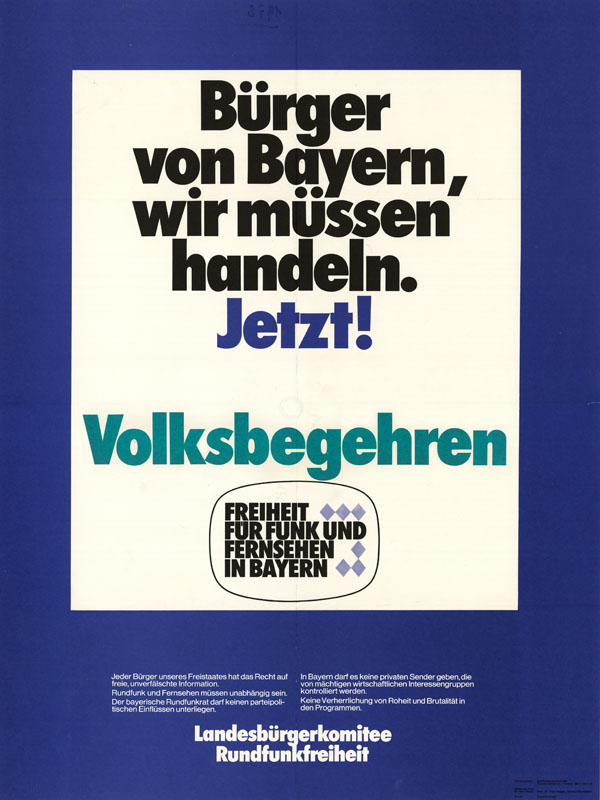 Plakat zum Volksbegehren "Rundfunkfreiheit" aus dem Jahre 1972 (Bayerisches Hauptstaatsarchiv, Plakatsammlung Nr. 30259)