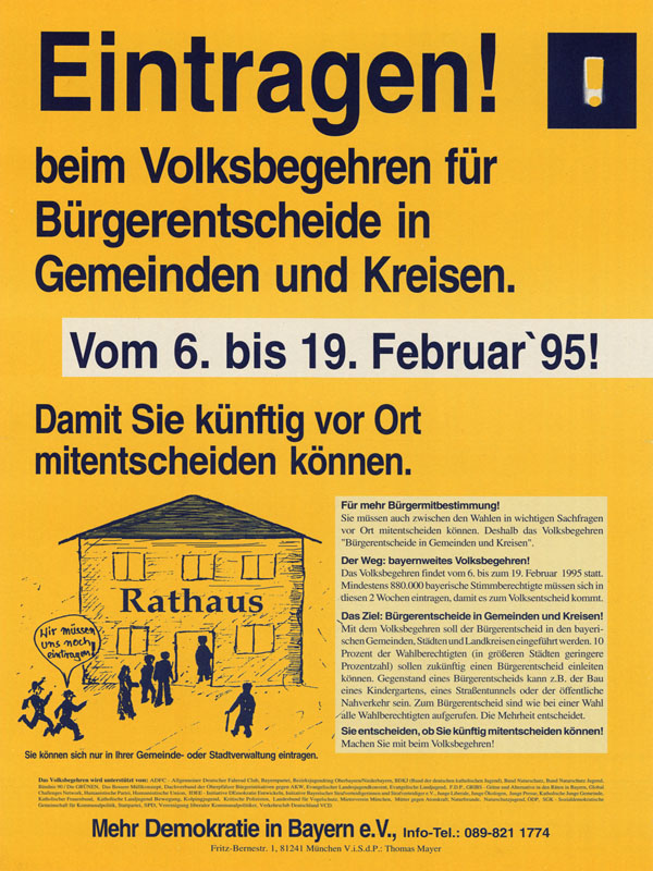 Plakat zum Volksbegehren "Mehr Demokratie in Bayern" aus dem Jahre 1995