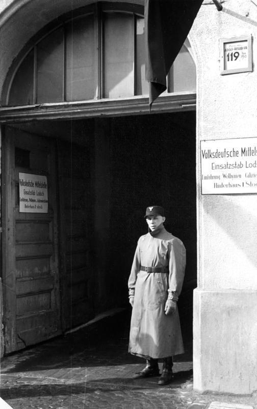 Wachposten vor dem Eingang zur Volksdeutschen Mittelstelle, ehem. Einsatzstab Łódź. Foto von 1940. (Bundesarchiv, Bild 137-056310/CC-BY-SA 3.0) HLB