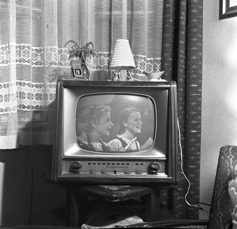 Das Fernsehen trug ab den 1950er Jahren mit eigenen Sendungen zur Volksmusik zu deren Verbreitung maßgeblich bei, wodurch sie zum Konsumgut breiter Bevölkerungsschichten wurde. Übertragung eines Konzerts im Fernsehen 1955. Foto von Georg Fruhstorfer (1915-2003), 1955. (Bayerische Staatsbibliothek, Bildarchiv fruh-08970) HLB