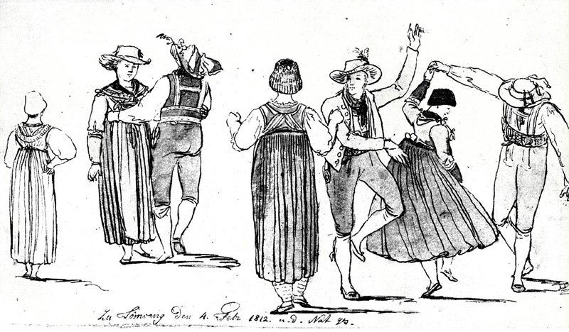 Tanzende in verschiedenen Haltungen und Positionen "Zu Törwang den 4. Febr. 1812 nach der Natur gezeichnet" von Friedrich Wilhelm Doppelmayr (1776–1845). Doppelmayr war von 1804 bis 1816 Aktuar am Königlichen Landgericht Rosenheim und zeichnete in diesem Zeitraum viele Motive in der Umgebung der Stadt. (Sparkasse Rosenheim-Bad Aibling) HLB