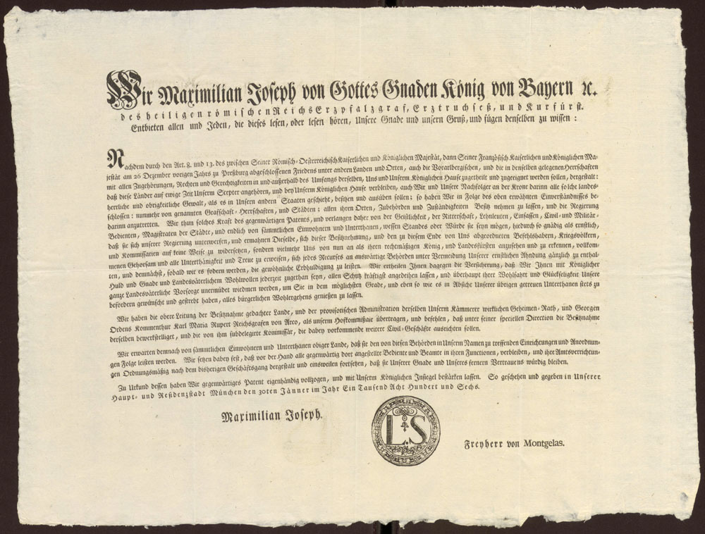 Sogenanntes „Besitzergreifungspatent“ vom 30. Jänner 1806. (VLA, Administration Hohenems, Nr. 42, Akt 61/1806) HLB