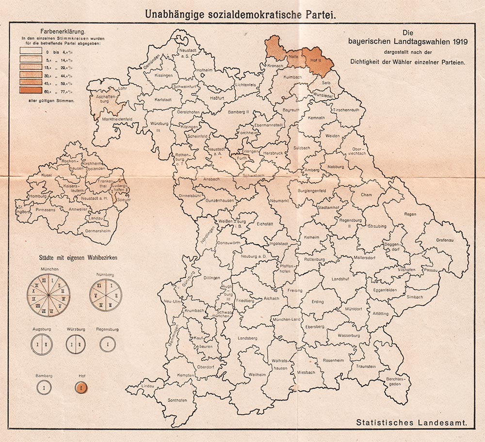 Karte mit den Wahlergebnissen der Landtagswahl vom 12. Januar 1919 für die USPD. Abb. aus: Zeitschrift des Bayerischen Statistischen Landesamts 51 (1919), 900. (Bayerische Staatsbibliothek 2 Bavar. 932 m-51)