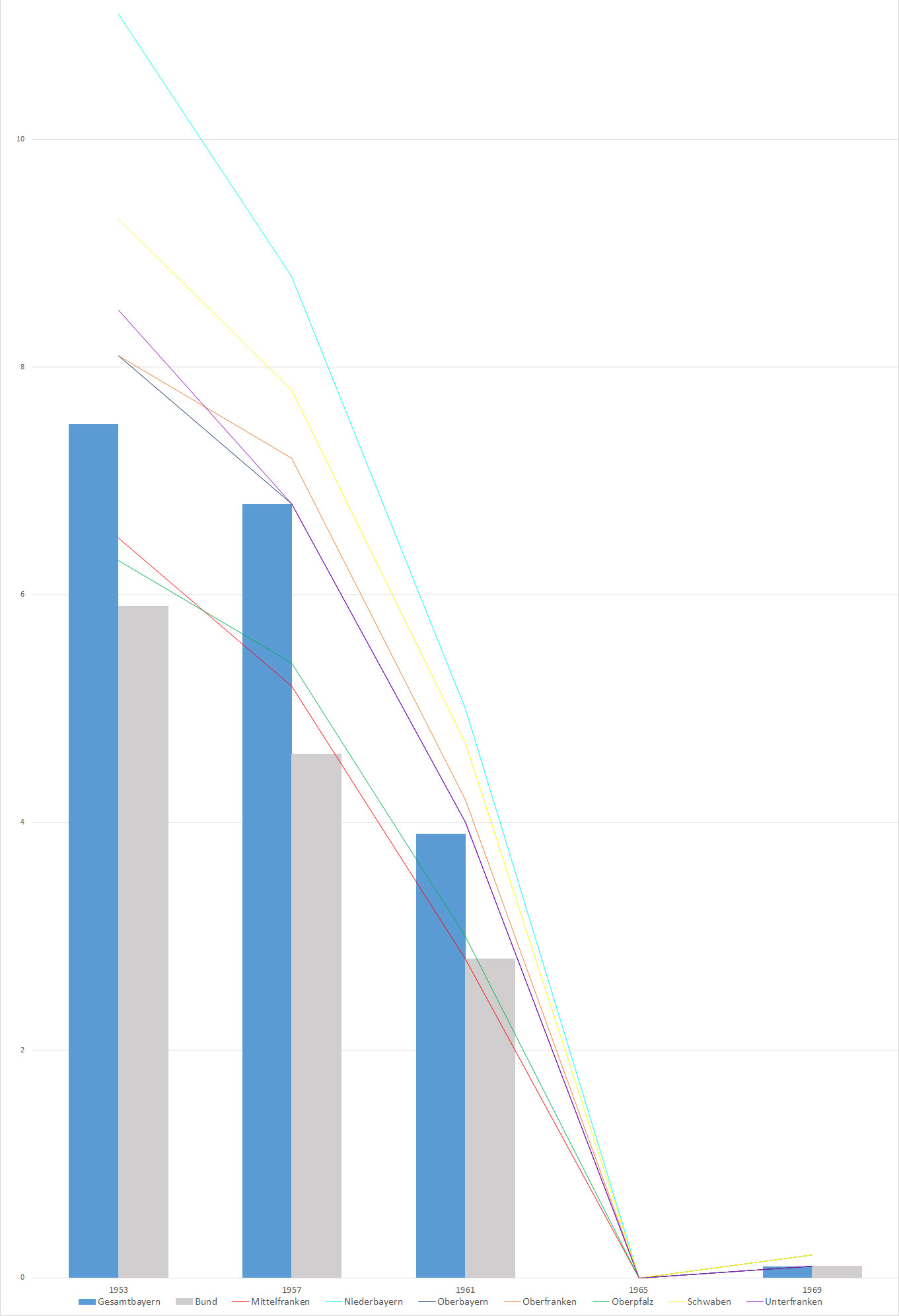 Wahlergebnisse des Blocks der Heimatvertriebenen und Entrechteten (BHE) bei Bundestagswahlen von 1953 bis 1969 in Prozent. HLB