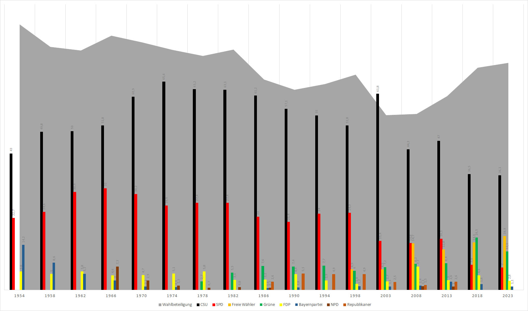 Wahlergebnisse der Bezirkstage in Schwaben von 1954 bis 2023. (Quelle: Eigene Darstellung auf Basis der amtlichen Wahlstatistik) HLB