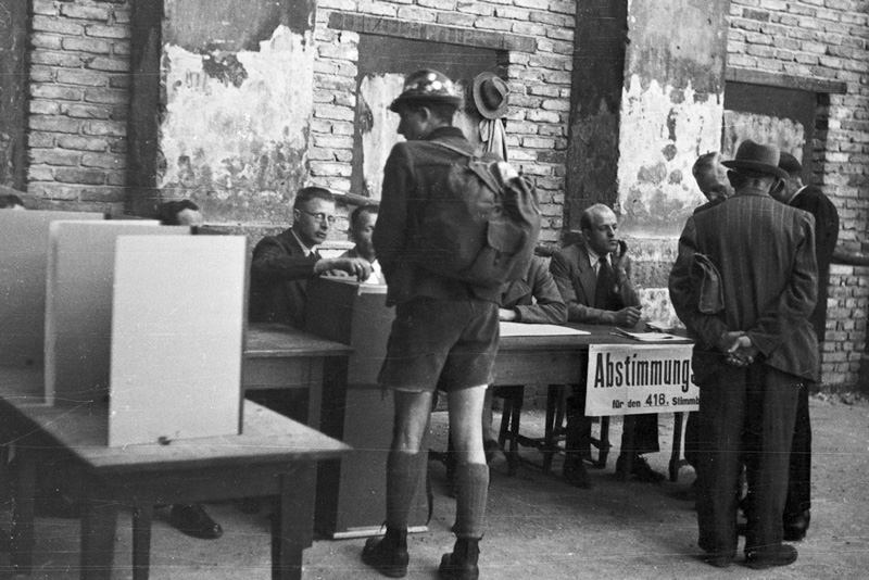 Am 30. Juni 1946 wählten die Bayern nach einem Verhältniswahlrecht die Verfassunggebende Landesversammlung. Das Foto zeigt die noch recht improvisiert anmutende Situation in einem Münchner Wahllokal. (Haus der Bayerischen Geschichte, Bayerisches Pressebild, bp-0458.3.4) HLB