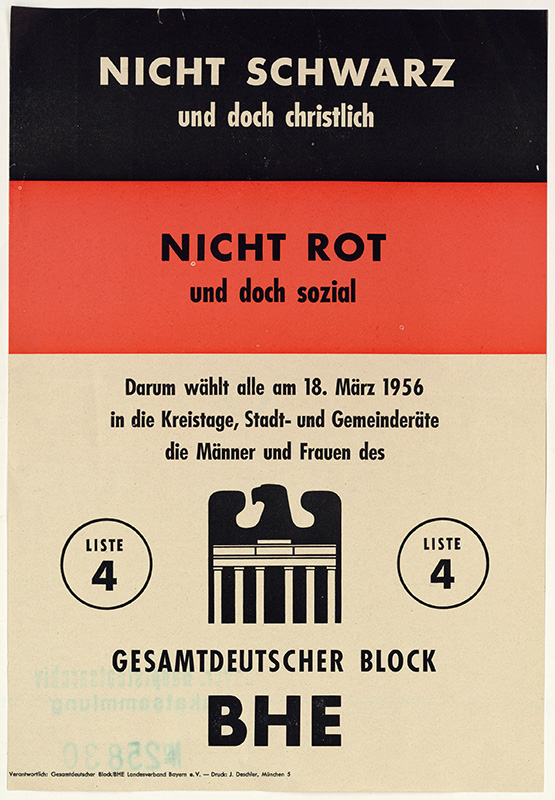 Wahlplakat des BHE für die bayerischen Kommunalwahlen 1956. Druck bei Josef Deschler, München. (Bayerisches Hauptstaatsarchiv, Plakatsammlung 25830)