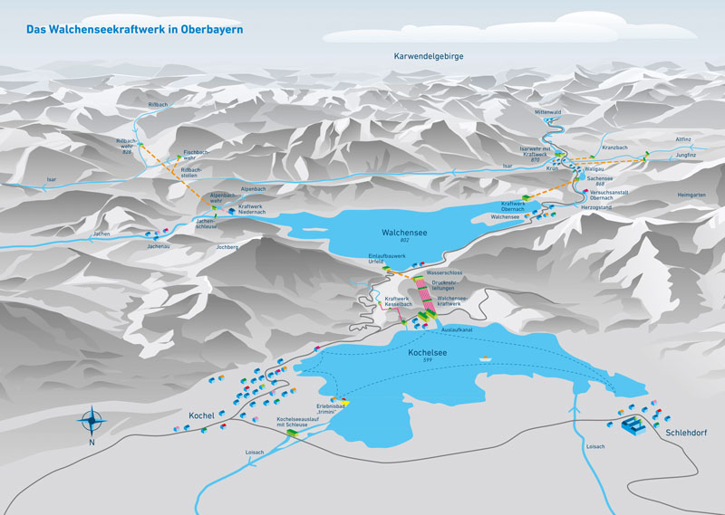 Grafik der Kraftwerke, Wehre, Stollen und Kanäle des Walchenseesystems, 2019. (Uniper Kraftwerke) HLB