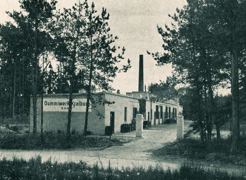Ehemalige Bunker in Waldkraiburg wurden zu einer Gummifabrik umgebaut. Seit 1947 produziert das Gummiwerk KRAIBURG mit derzeit etwa 400 Mitarbeitern Kautschuk-Mischungen. (Foto aus: Lindner, Walter: Waldkraiburg. Vom Bunker zur Siedlung, München 1950, 63)