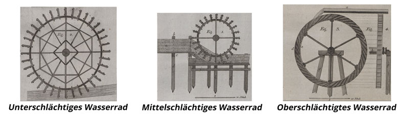 Darstellung von Typen von Wasserrädern. Abb. aus: Caspar Walter, Architectura Hydraulica. Oder: Anleitung zu denen Brunnenkünsten, Augsburg 1765 (Ausschnitte aus Taf. I, Taf. V. u. Taf. VI). (Bayerische Staatsbibliothek, Res/2 A.hydr. 31-1/2) HLB