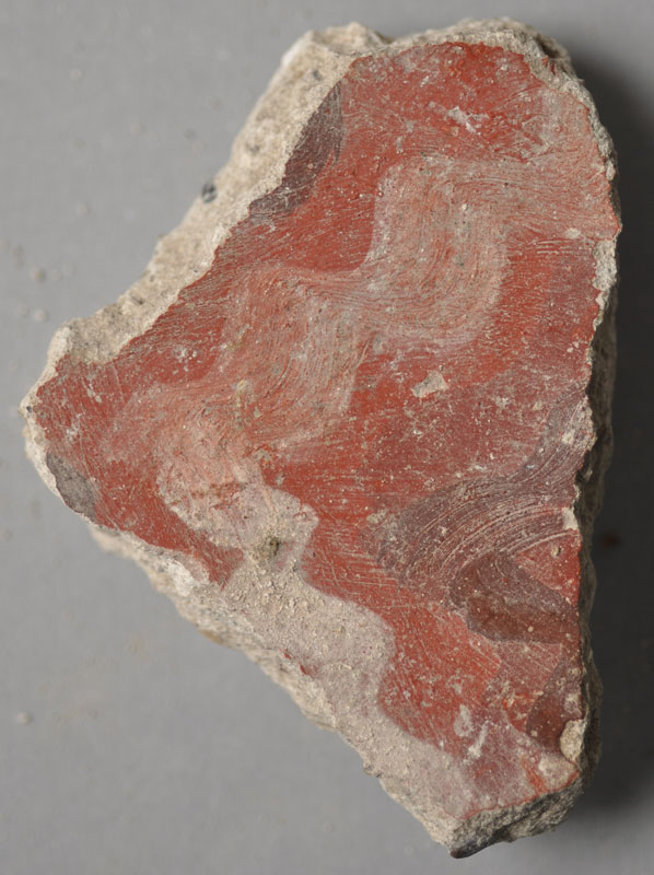 Wandmalereifragment mit umbrechenden Wellenlinien eines gemalten Marmorsockels aus dem Regensburger Niedermünster (ca. Mitte 9. Jahrhundert). (Foto: Skriver) HLB