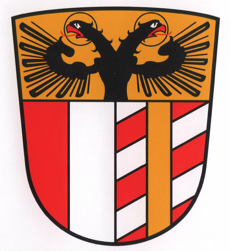Wappen des Bezirks Schwaben. Offizielle Wappenbeschreibung: "Unter goldenem Schildhaupt, darin ein wachsender, rot bewehrter und golden nimbierter schwarzer Doppeladler, gespalten; vorne gespalten von Rot und Silber, hinten fünfmal schräglinks geteilt von Silber und Rot, überdeckt mit einem goldenen Pfahl." (Quelle: Bezirk Schwaben)