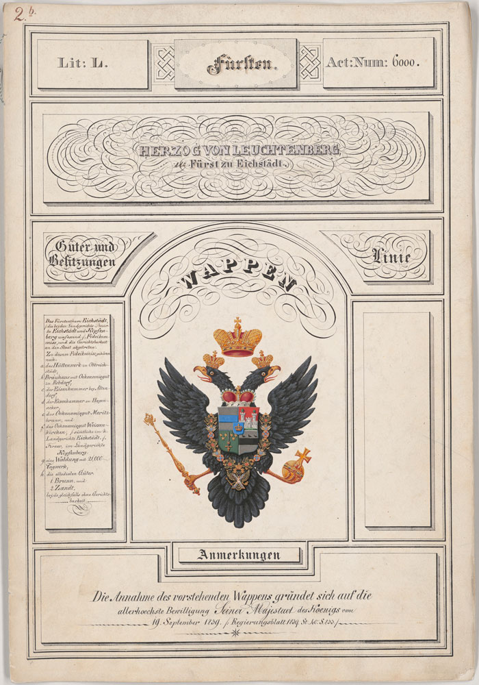 Wappen Herzog Maximilians von Leuchtenberg, das ihm nach seiner Hochzeit 1839 mit Großfürstin Maria Nikolajewna durch Zar Nikolaus I. verliehen wurden. (Bayerisches Hauptstaatsarchiv, Adelsmatrikel L2)