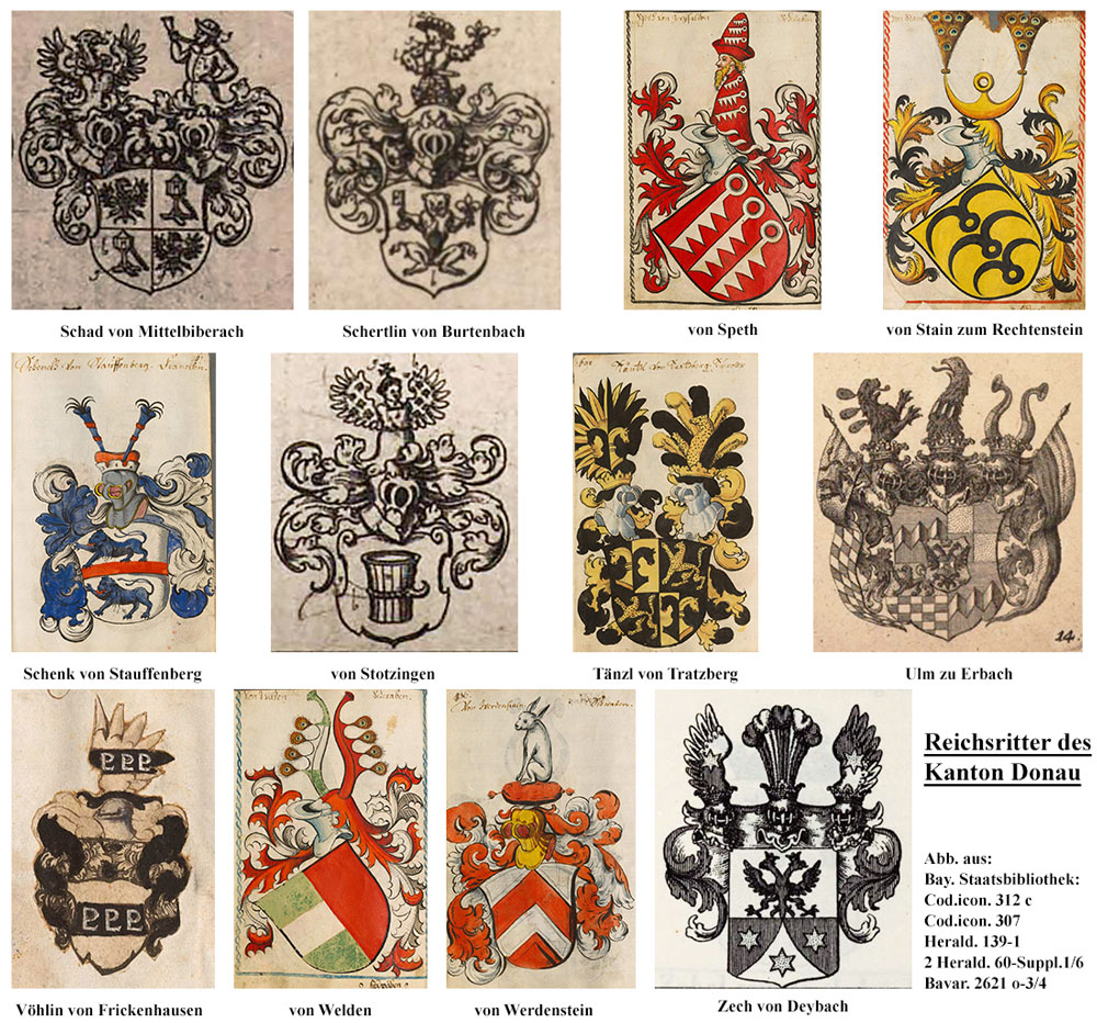 Wappen der wichtigsten Mitgliederfamilien des Kanton Donau. Abbildungen aus verschiedenen Wappenbüchern. (Bayerische Staatsbibliothek)
