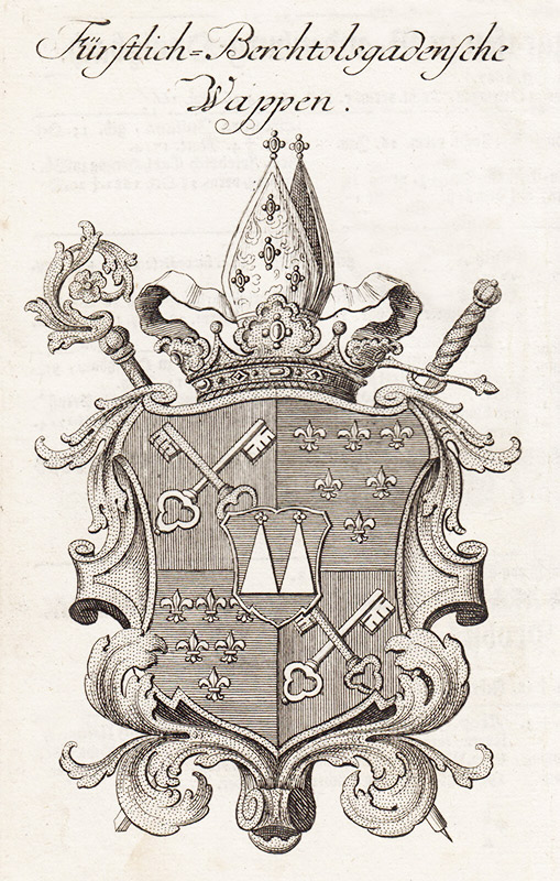 Wappen des Fürstpropstes Julius Heinrich von Rehlingen-Radau (reg. 1723-1732). Es besteht aus dem Wappen der Fürstpropstei und seinem Familienwappen im Herzschild. Kupferstich von Christoph Weigel, 1729. (Stadtarchiv Bad Reichenhall) HLB