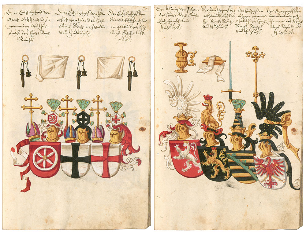 Wappen der sieben Kurfürsten. Abb. aus dem Wappenbuch Konrads von Grünenberg, 1602-1604, fol. 7r u. 8r. (Bayerische Staatsbibliothek, Cgm 9210)